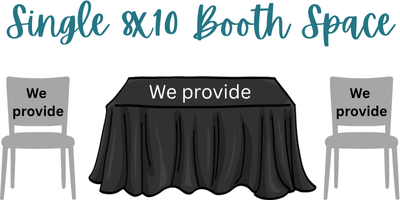An 8x10 space. You provide: one 6 or 8ft. table, a floor-length black skirt or tablecloth (required by venue). We'll provide two chairs.